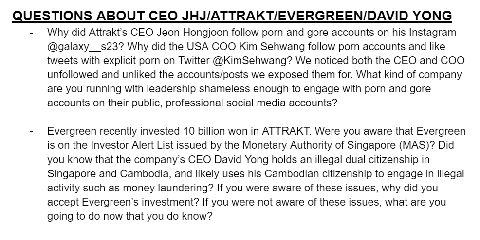 사기꾼 일당은 "에버그린은 최근 어트랙트에 100억 원을 투자했다. 여러분은 에버그린이 싱가포르 금융당국이 발표한 투자자 경보 리스트에 올라 있다는 사실을 알고 있었나요? 데이비드 용이 싱가포르와 캄보디아에서 불법 이중국적을 가지고 있으며 자금 세탁 등 불법 행위를 할 가능성이 높다는 사실을 알고 있었나요? 이러한 문제를 알고 있었다면 왜 에버그린의 투자를 수락했나요?"라는 황당한 주장을 하기도 했습니다.