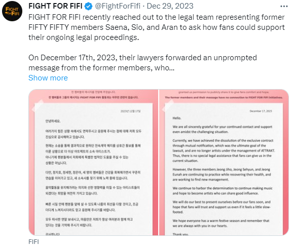 피피 계정은 "최근 피프티피프티 멤버였던 새나, 시오, 아란을 대표하는 법무팀에 연락하여 팬들이 어떻게 그들의 진행 중인 법적 절차를 지지할 수 있는지 물었다"며 "2023년 12월 17일, 그들의 변호인단은 팬들에게 위로와 희망을 주기 위해 공개적으로 공유할 수 있도록 허락한 전 멤버들의 즉흥적인 메시지를 전달했다"고 공개했습니다.