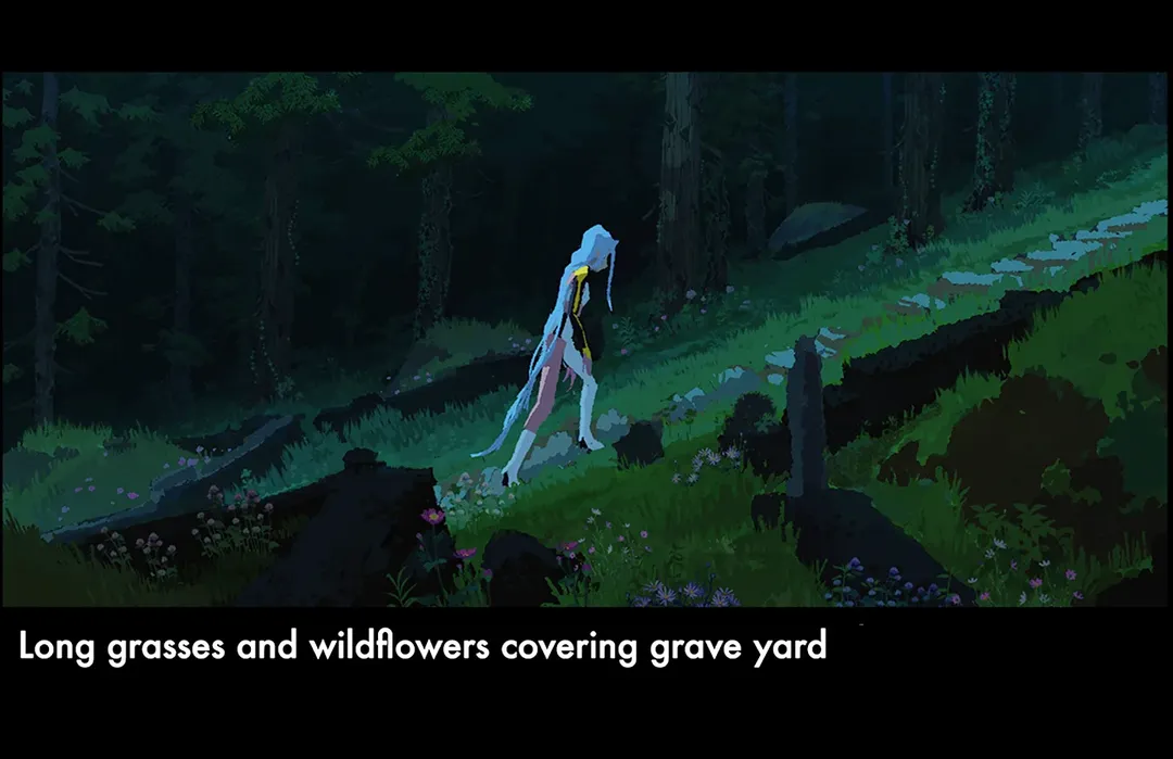 묘지는 셀린 덕분에 여전히 잘 관리되어 있고, 주변에는 들꽃이 피어 있다