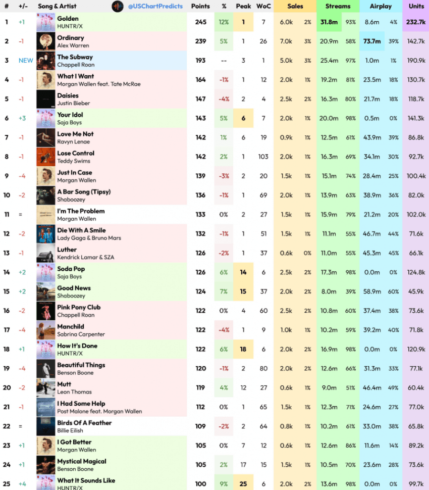 따라서, 헌트릭스의 '골든'은 6점 차이로 알렉스 워렌(Alex Waren)의 '오디너리'를 추월해 1위를 차지할 것으로 예상됩니다.