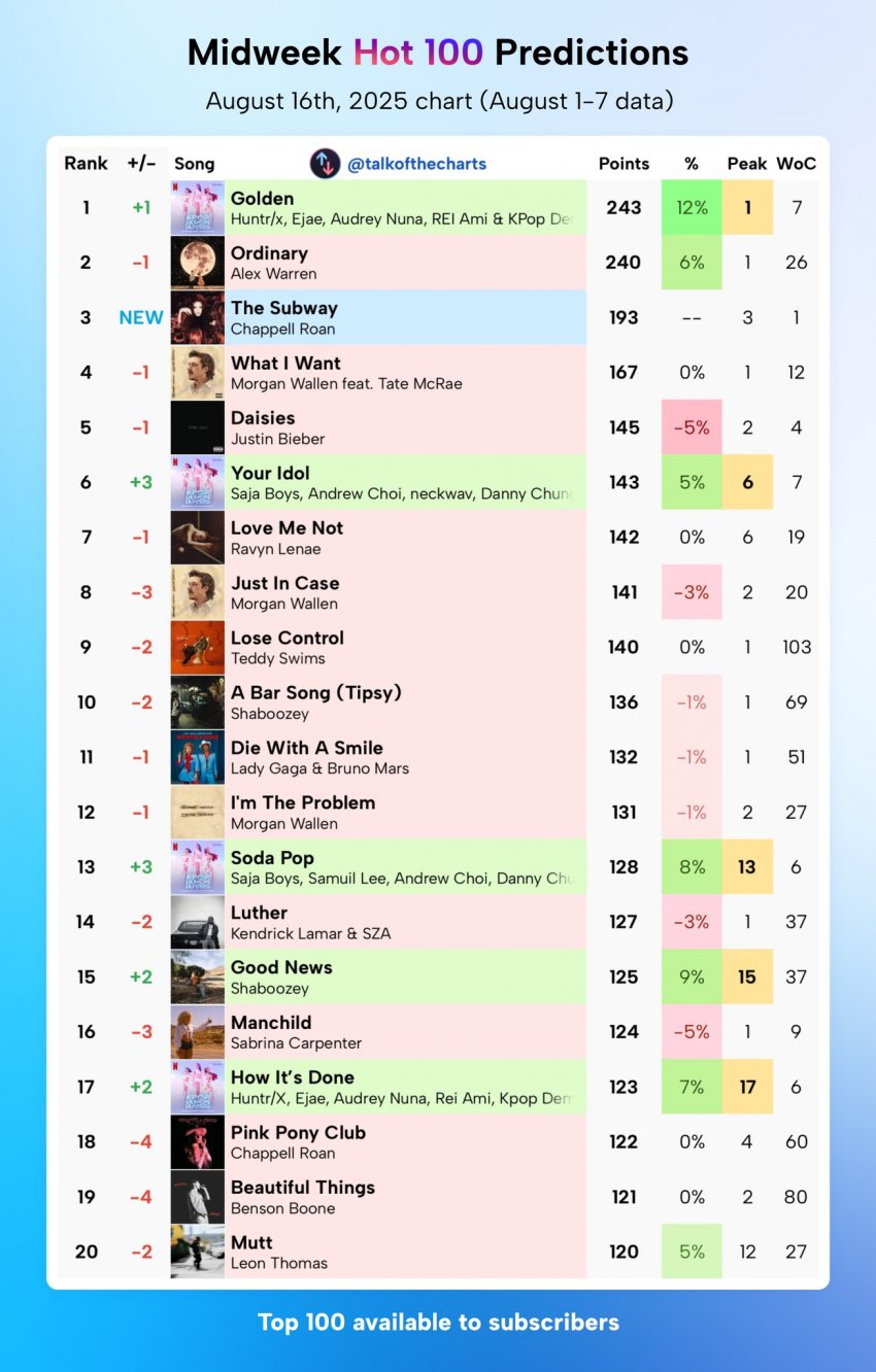 음원 순위 예측 사이트 '토크 오브 더 차트(Talk of the Charts)'와 '차트 프레딕션즈(Chart Predictions)'가 잇달아 '골든(Golden)'이 이번주 8월 2주차에 빌보드 핫100 차트에서 1위를 차지할 것으로 예측했습니다.