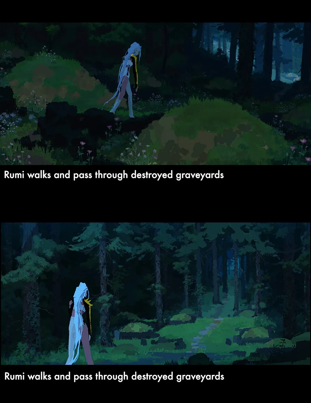 루미가 부서진 묘지 사이를 걸어 지나간다