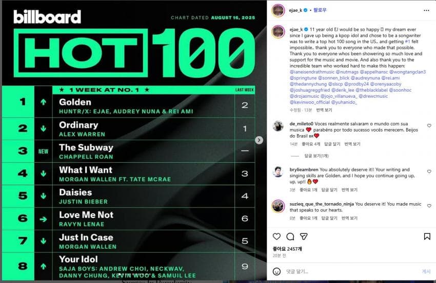 이재(EJAE)는 SNS에서 빌보드 1위 소식에 영어로 "11살의 이재는 정말 행복해할 거예요. K팝 아이돌을 포기하고 작곡가의 길을 선택한 이후로 제 꿈은 미국 핫100 차트에 진입하는 곡을 쓰는 것이었어요. 그리고 1위를 한다는 건 불가능하게만 느껴졌죠. 이 꿈을 가능하게 해주신 모든 분들께 감사드립니다. 음악과 영화에 이렇게 많은 사랑과 응원을 보내주신 모든 분들께도 감사드려요. 그리고 이 일을 이루기 위해 열심히 노력해주신 놀라운 팀에도 감사드립니다."라고 감사의 글을 남겼습니다.