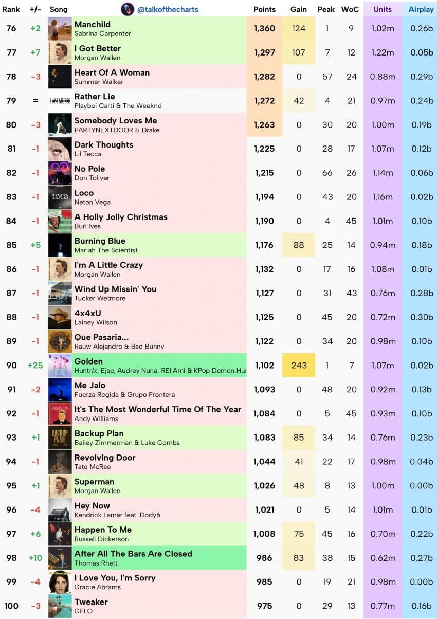 '골든'은 빌보드 핫100 연말 결산 차트 예측에 90위로 처음 진입했습니다.