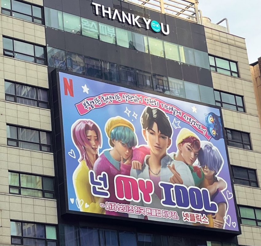 강남역 부근에 헌트릭스 및 사자보이즈 응원 광고가 노출돼 관심을 끌고 있습니다.