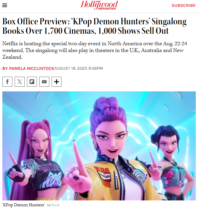 넷플릭스 애니메이션 영화 'K팝 데몬 헌터스'의 극장판 싱어롱 이벤트 버전의 예매가 시작된 후 매진이 이어지는 가운데 이미 1000회차가 매진된 상태라고 합니다.
