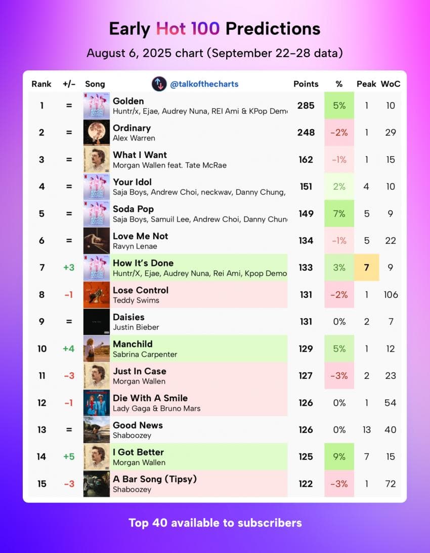 음원 순위 예측 사이트 '토크 오브 더 차트(Talk of the Charts)'는 다음주 빌보드 핫100 차트 순위 초기 예측에서 2주 연속 '골든'이 1위를 예상했습니다.