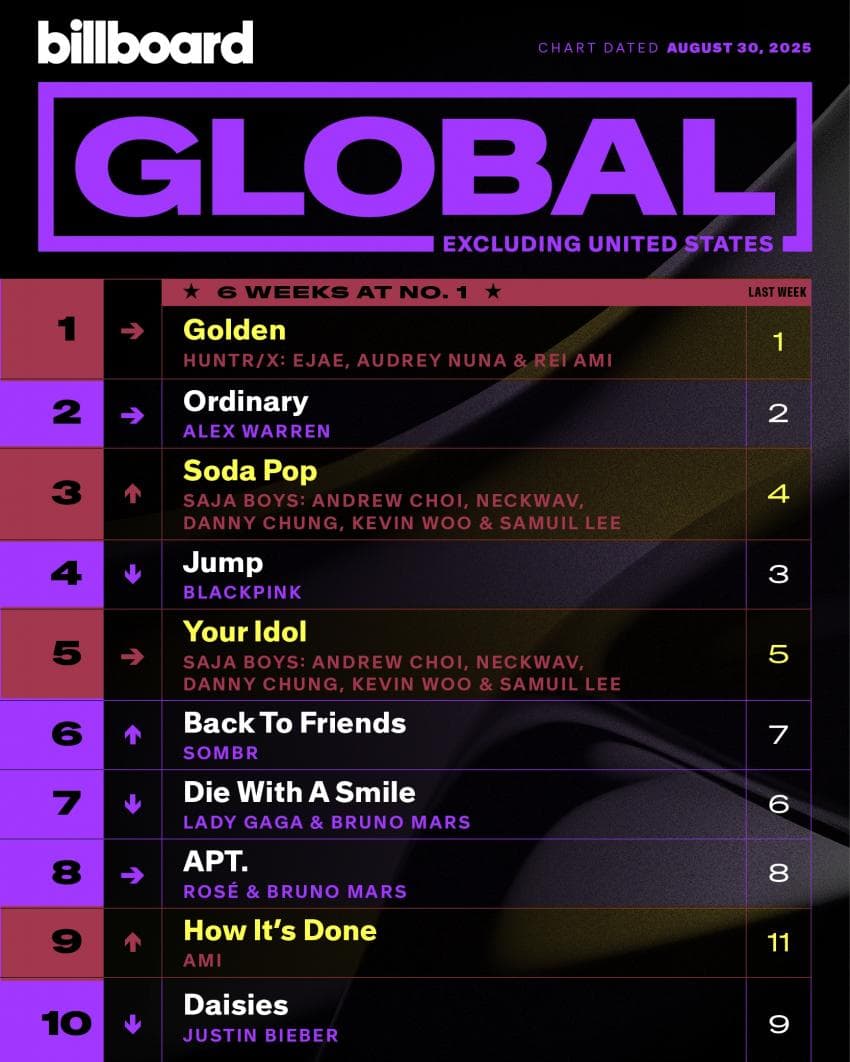 또한 미국을 제외한 빌보드 글로벌 200 차트(Billboard Global 200 Excluding U.S.)에서는 '골든' 1위, 소다팝 3위, 유어 아이돌 5위, 하우 잇츠 던 9위를 기록했습니다.