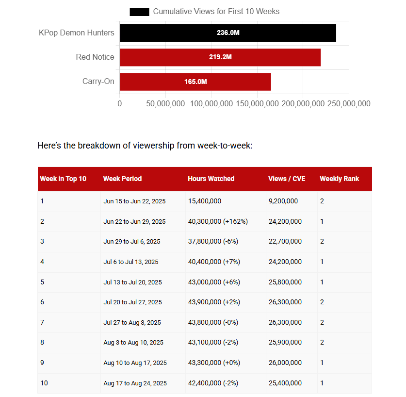 구체적으로 설명하자면, 'K팝 데몬 헌터스'는 개봉 후 91일 이내 가장 많은 시청 수를 기준으로 순위를 매기는 넷플릭스 최다 시청 영화 순위에서 '레드 노티스'를 밀어냈습니다.