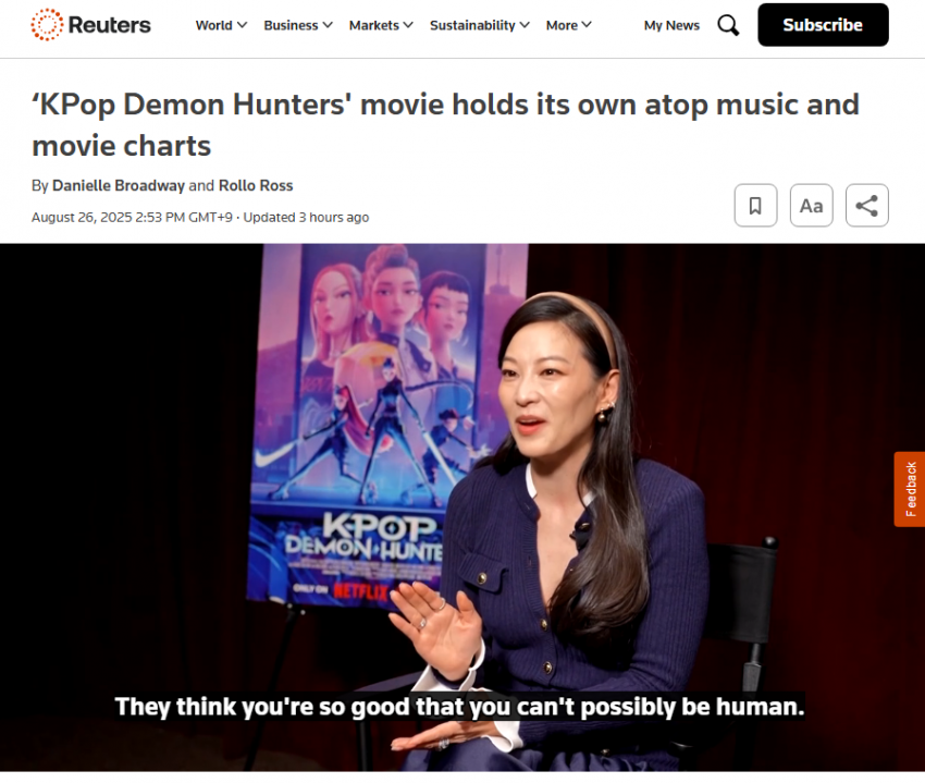 세계적 통신사 '로이터'는 "케이팝 데몬 헌터스(KPop Demon Hunters), 영화 음악 및 영화 차트 동시 석권"이라는 제목으로 이재(EJAE) 인터뷰 등을 소개했습니다.