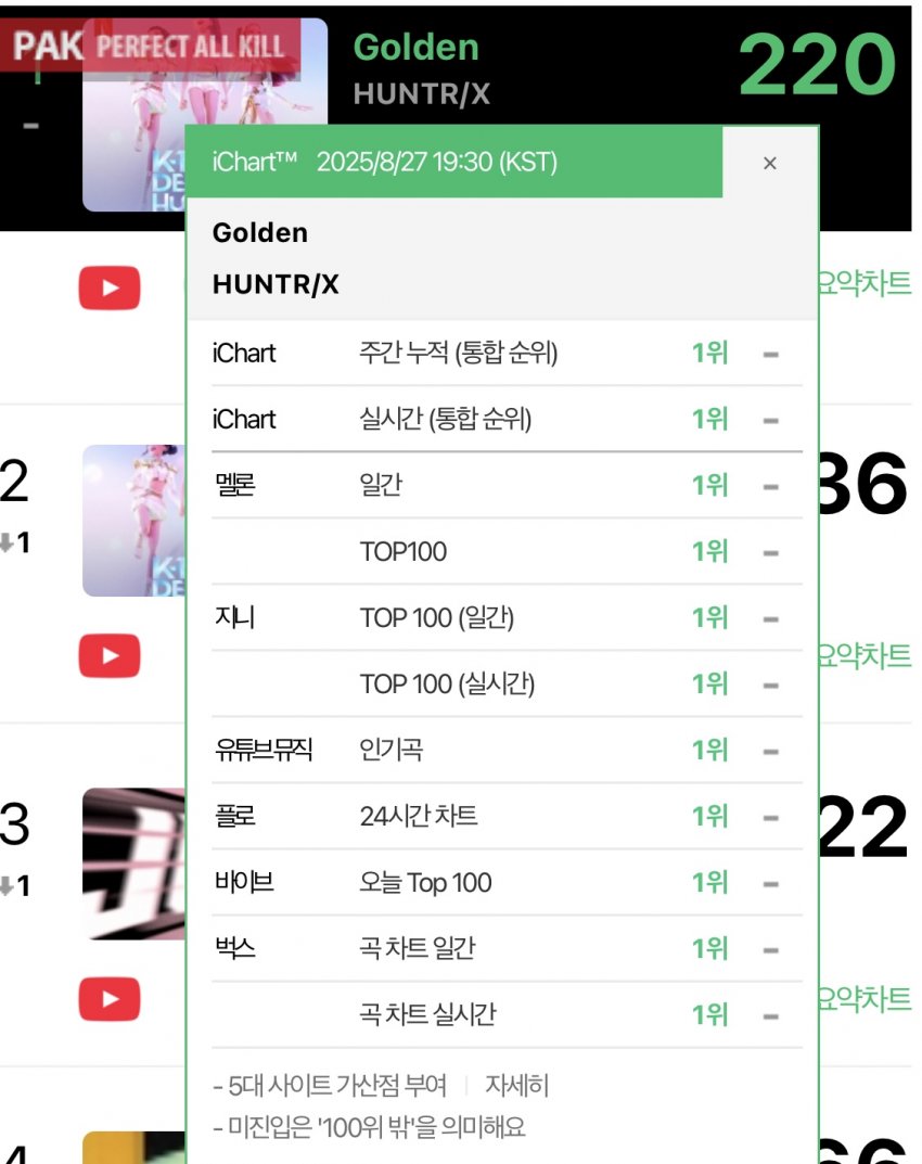 넷플릭스 애니메이션 영화 'K팝 데몬 헌터스', 즉 '케데헌'이 영화 및 음악 관련 세계적 기록을 갈아치우고 있는 가운데 '골든(Golden)'이 그야말로 "영원히 깨질 수 없는" '퍼펙트 올 킬(Perfect All Kill)' 1000회 기록을 돌파했습니다.