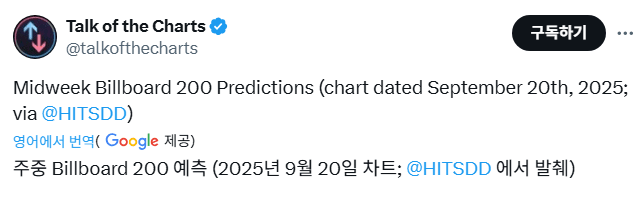 토크 오브 차트(Talk of the Charts)가 다음주 빌보드200 예측 결과 '케데헌' OST 앨범이 사상 처음 1위에 오를 전망이라고 발표했습니다.