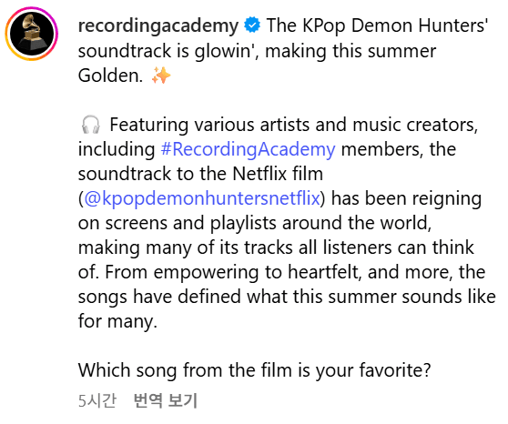 그래미상 주관 단체 '레코딩 아카데미(RecordingAcademy)' SNS는 "'K팝 데몬헌터스'의 사운드트랙이 빛나고 있으며 이번 여름을 골든(Golden)으로 물들이고 있다"고 샤라웃했습니다.