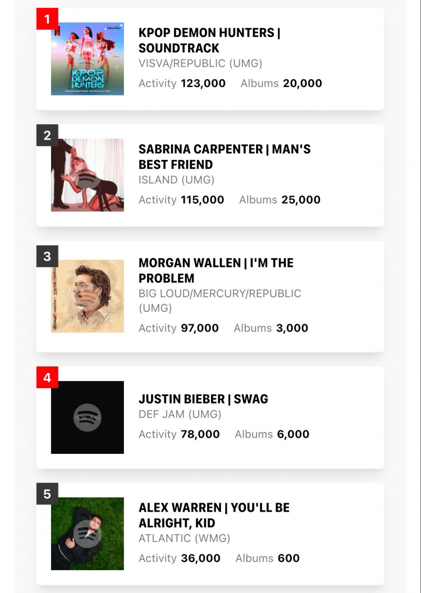 다음주 빌보드200 예상 순위는 1위 '케데헌' 사운드트랙, 2위 사브리나 카펜터, 3위 모간 월렌(Morgan Wallen), 4위 저스틴 비버, 5위 알렉스 워렌 순이었습니다.
