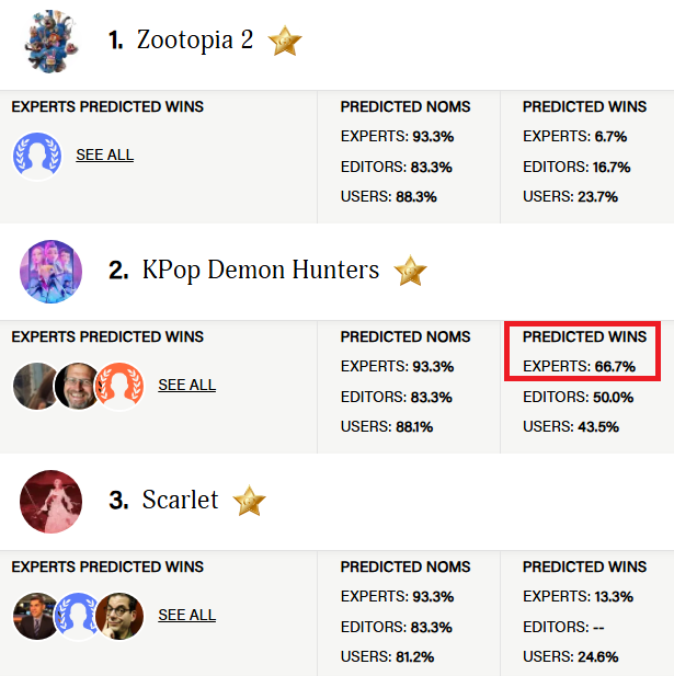 수상 전문 매체 '골든더비'에 따르면 아카데미상 수상 예측에서 '케데헌'이 전문가들로부터 66.7%라는 압도적 1위 평가를 받았습니다.
