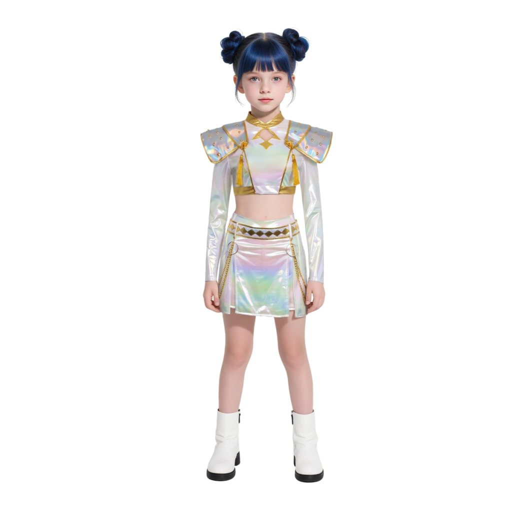 영화에서 루미의 흰색 의상 세트에는 하이넥 크롭탑과 어울리는 반바지, 황금 벨트, 허리 체인, 테슬 펜던트 등 5가지가 포함되어 있습니다.