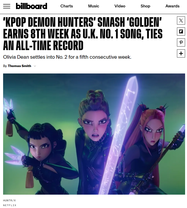 빌보드 또한 "‘케데헌'의 히트곡 ‘골든(Golden)’, 영국 싱글 차트 8주 1위... 역대 최고 기록과 타이 기록"이라는 제목의 기사를 보도했습니다.