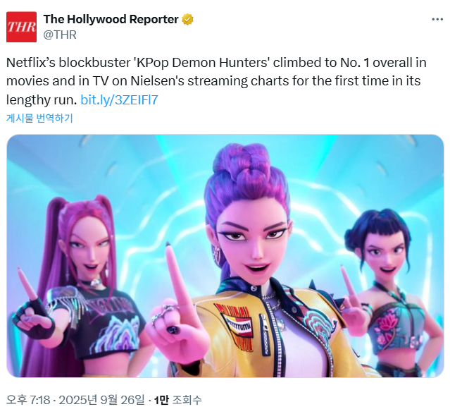 영화 전문 매체 '더 할리우드 리포터' SNS는 "넷플릭스의 블록버스터 '케이팝 데몬 헌터스'가 긴 상영 기간 동안 마침내 처음으로 닐슨 스트리밍 차트에서 영화와 TV 부문 전체를 통틀어 종합 1위에 올랐다"고 공개했습니다.