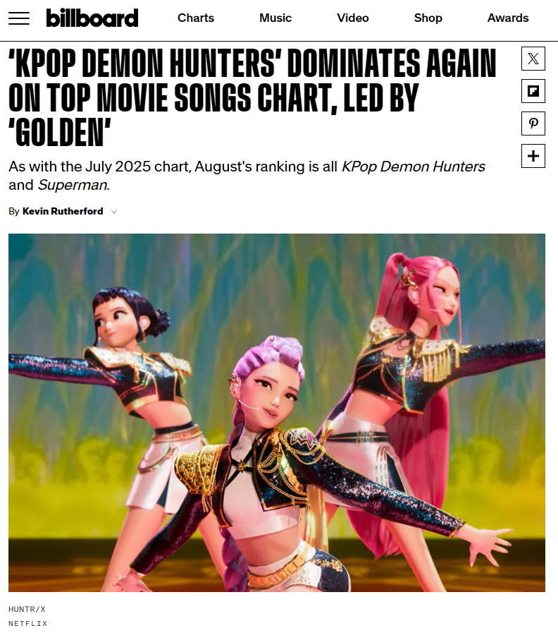 '케데헌' OST 7곡 전곡이 빌보드의 '톱 무비 송(Top Movie Songs)' 차트에서 1위부터 7위까지 2달 연속 줄세우기를 했습니다.