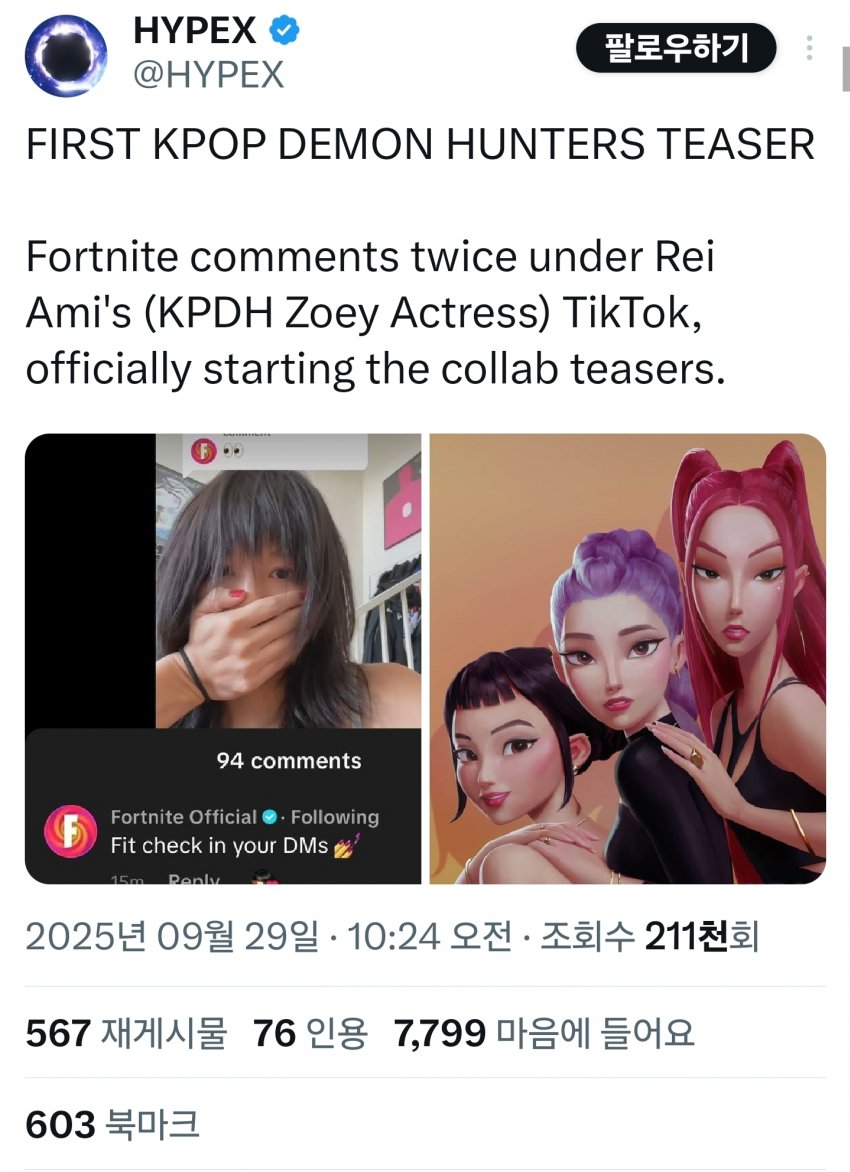 400만 팔로워를 가진 파워유저 하이펙스(HYPEX)는 "포트나이트가 할로윈을 맞이해서 '케이팝 데몬 헌터스'와 콜라보를 진행할 예정"이라며 "이외에도 스킨 뿐만 아니라 다양한 콜라보가 있을 예정"이라고 공개했습니다.