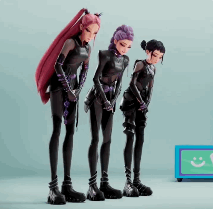 첫 번째 영상은 헌트릭스와 사자보이즈가 인사를 위해 허리를 과하게 굽히는 장면을 활용했습니다.