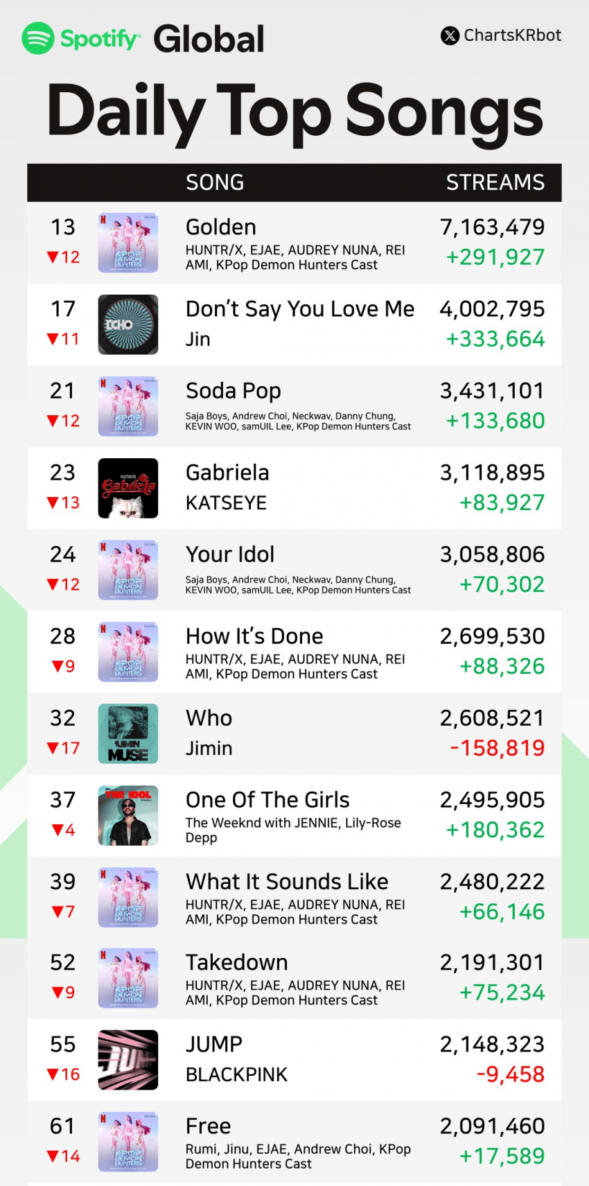 한편 애플뮤직에서도 '골든'은 13위로 급락하고 테일러 스위프트(Taylor Swift) 신곡이 1위에서 12위까지 차지했습니다.