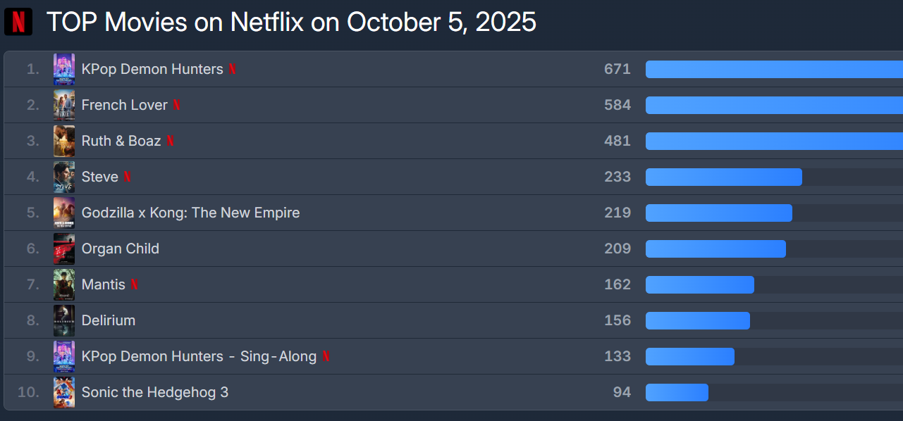 OTT 순위 집계 사이트 플릭스패트롤에 따르면 5일 기준 '케데헌'은 671점을 얻어 2일 연속 1위에 올랐습니다.