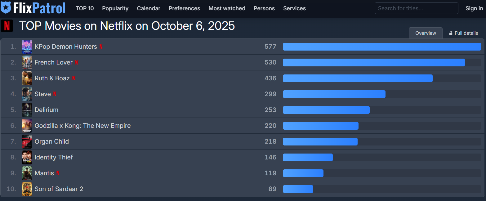 OTT 순위 집계 사이트 플릭스패트롤에 따르면 6일 기준 '케데헌'은 577점을 얻어 또 1위를 이어갔습니다.