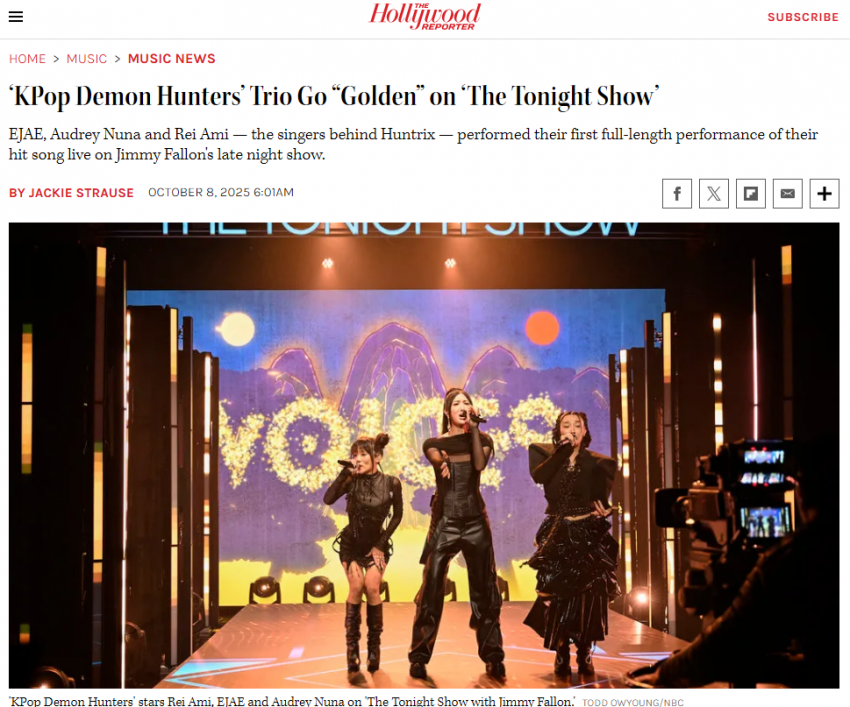 영화 전문 매체 '할리우드 리포터'는 "'케데헌' 트리오, '투나잇 쇼'에서 "골든(Golden)" 무대 선보여"라는 제목의 기사를 게재했습니다.