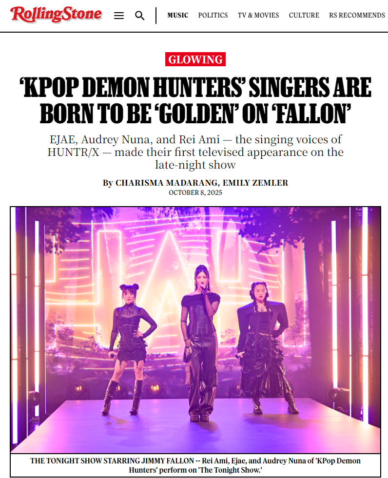 음악 전문 매체 '롤링스톤'은 "'케데헌' 가수들, 지미 팰런쇼에서 '골든'으로 태어났다"는 제목의 보도를 했습니다.