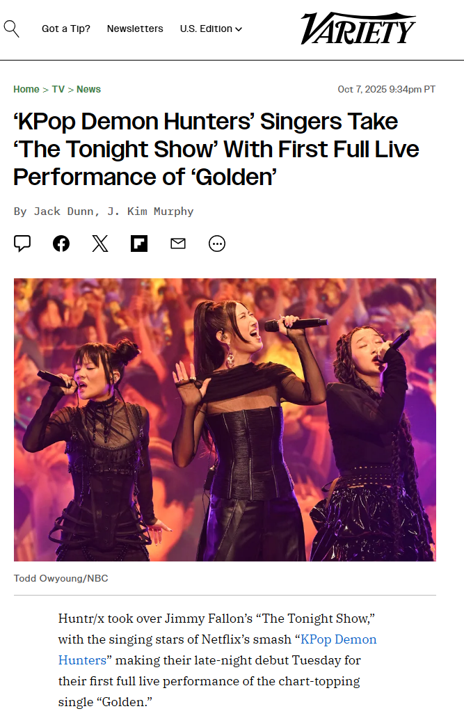 또 다른 영화 전문 매체 '버라이어티'는 "'케데헌' 가수들, '골든'의 첫 완전한 라이브 공연으로 '더 투나잇 쇼(The Tonight Show)' 접수"라는 제목으로 보도했습니다.