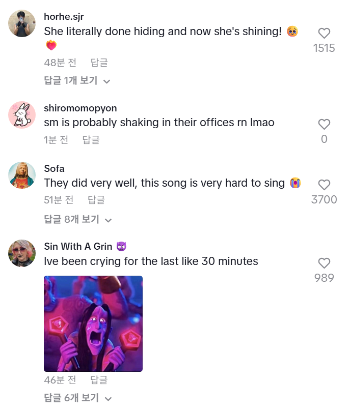 "다른 가수들 커버로 듣다가 진짜 목소리로 라이브를 들으니 뭔가 감동적이다... 셋다 정말 멋지고 사랑스러워요💕"