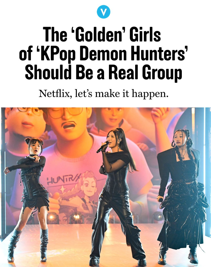 미국 연예 전문 매체 '벌처(Vulture)'는 "'K팝 데몬헌터스'의 '골든(Golden)' 걸들은 실제 그룹이 되어야 한다"는 제목과 함께 "넷플릭스, 이 일을 성사시켜봅시다"라고 촉구했습니다.