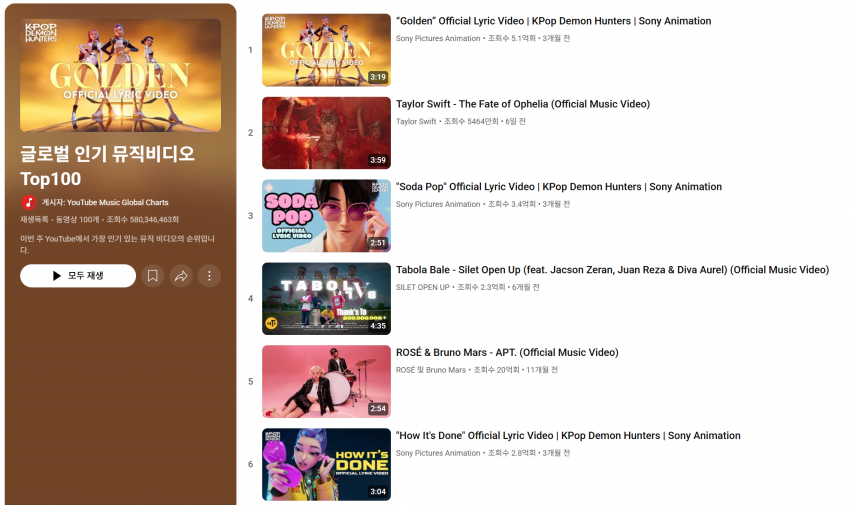 글로벌 인기 뮤직비디오 톱100에서 1위는 헌트릭스 '골든' 뮤직비디오, 이어 2위는 테일러 스위프트(Taylor Swift) 신곡 '더 페이트 오브 오필리아(The Fate of Ophelia)' 뮤직비디오였습니다.