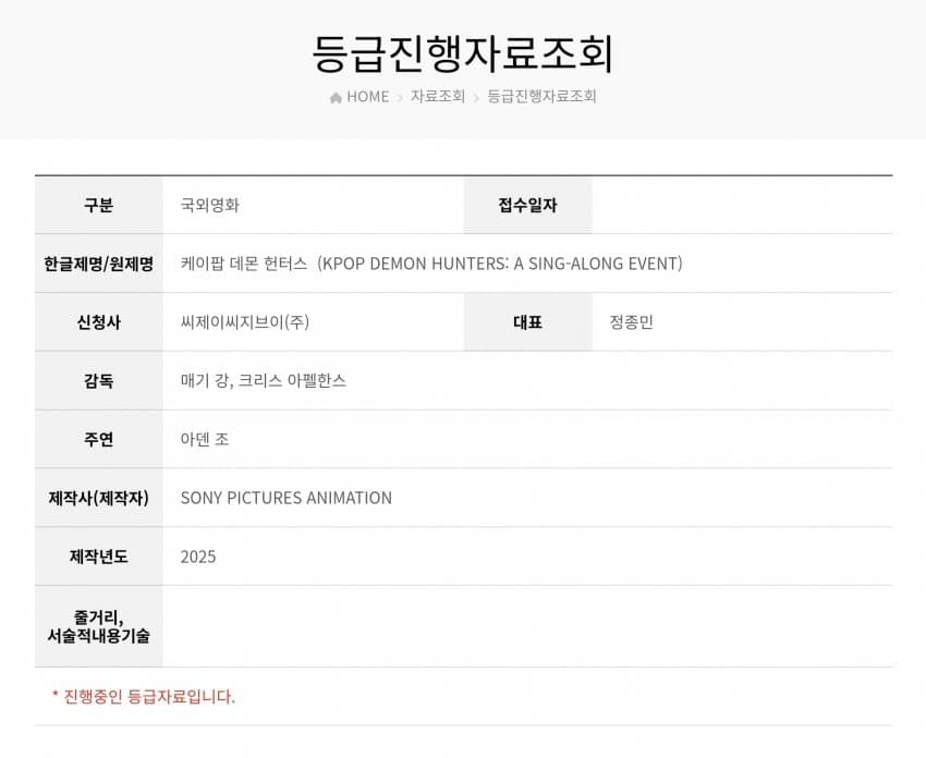 등급진행자료조회에 따르면 영화관 CGV의 '케이팝 데몬 헌터스 ; 싱어롱 이벤트'에 대한 심의 접수가 진행 중 입니다.