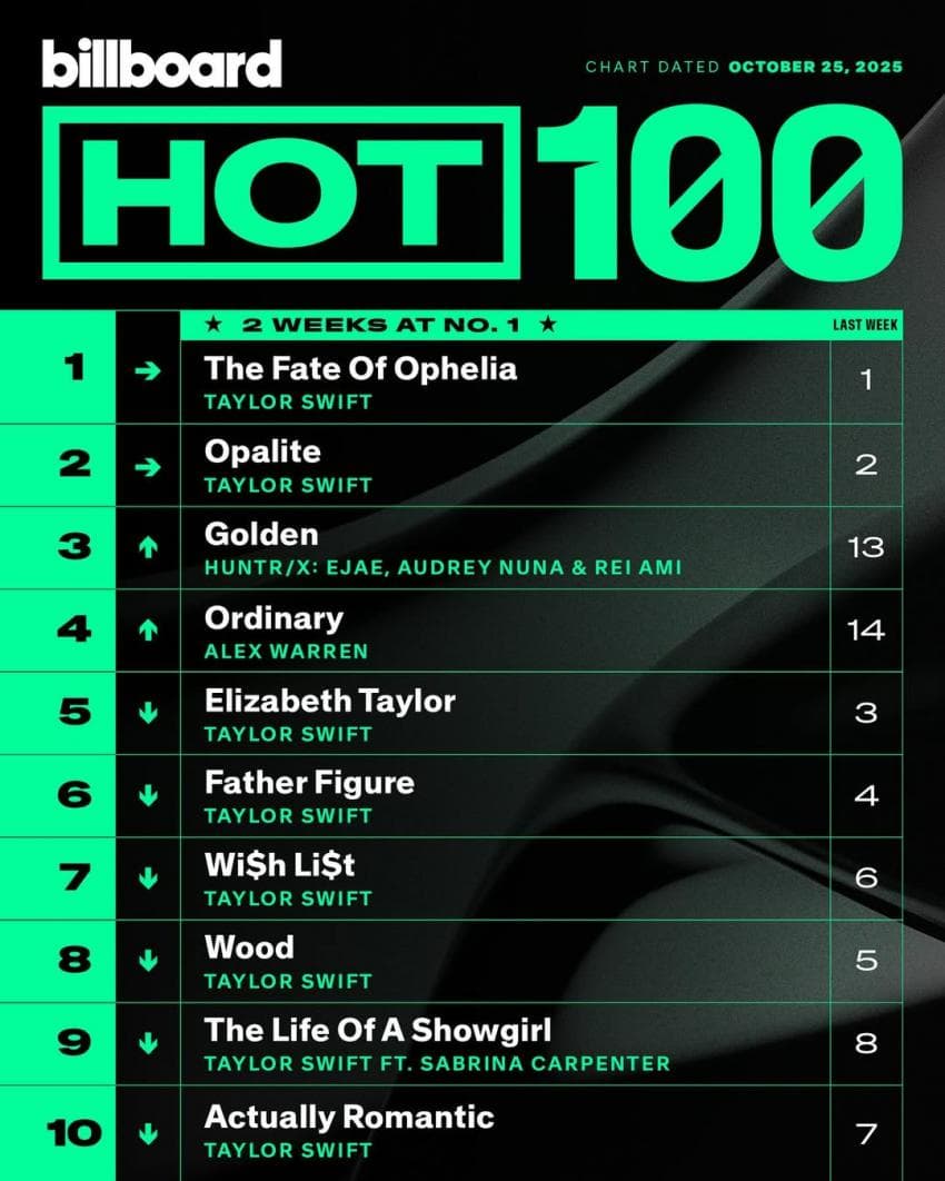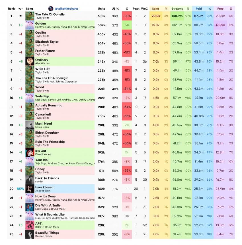 1위는 테일러 스위프트(Taylor Swift) 신곡 '더 페이트 오브 오필리아(The Fate of Ophelia)'는 334점으로 1위를 유지했습니다.