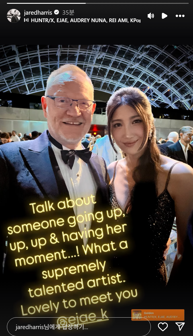 자레드 해리스는 SNS에 "계속 업업업 하며 최고의 순간을 맞이하고 있는 이분을 보세요. 정말 뛰어난 재능을 가진 아티스트입니다. 만나 뵙게 되어 기쁩니다"라고 적었습니다.