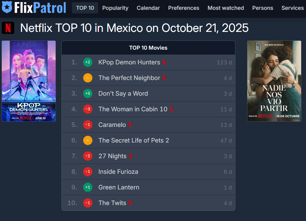 '케데헌'이 넷플릭스 멕시코에서 2일 연속 1위를 차지했습니다.