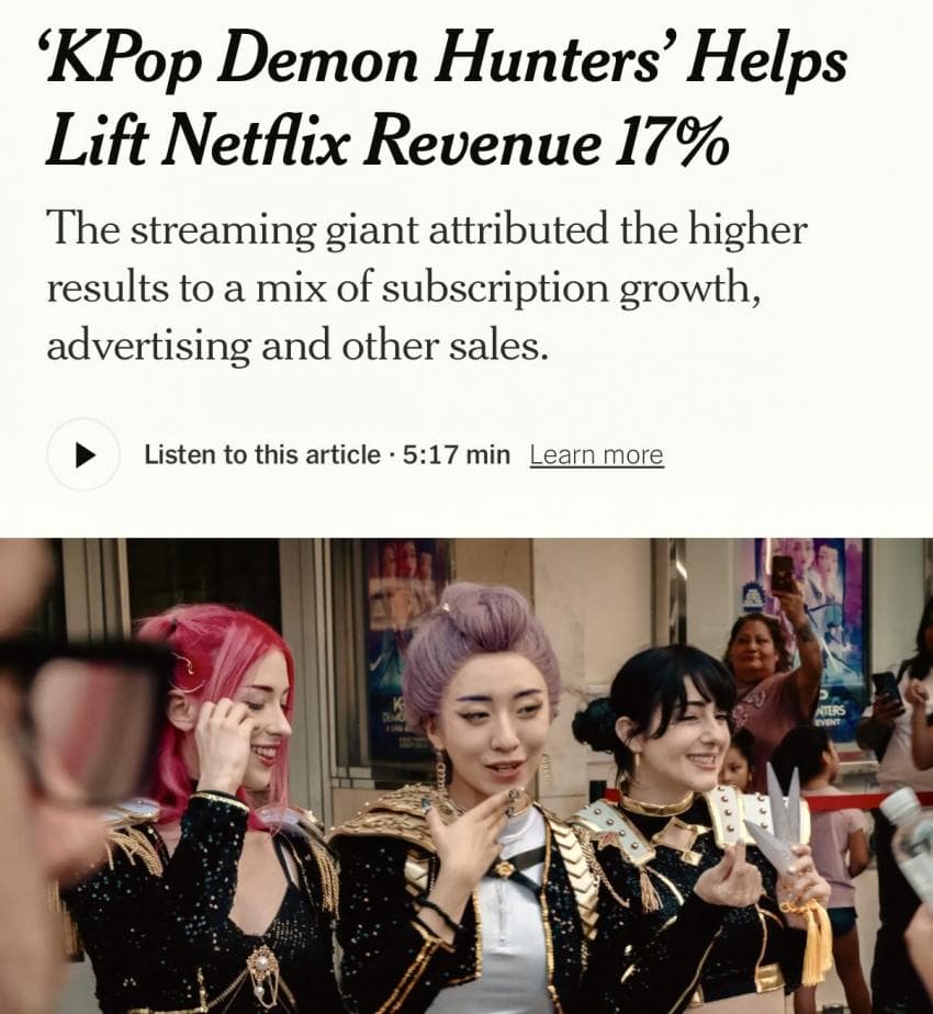 로스앤젤레스 타임스는 "케데헌, 넷플릭스 매출 17% 증가에 기여"라는 제목의 기사를 발표했습니다.