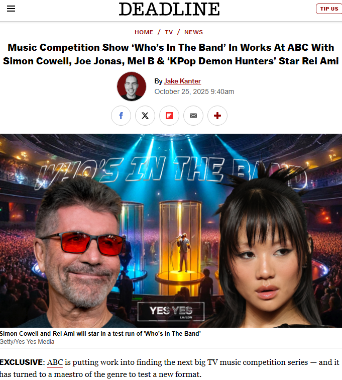 '데드라인'은 "음악 경연 쇼 '후즈 인 더 밴드(Who’s In The Band)' ABC 제작 추진… 사이먼 코웰, 조 조나스, 멜 B, '케데헌' 스타 레이 아미 출연"이라는 제목으로 보도했습니다.