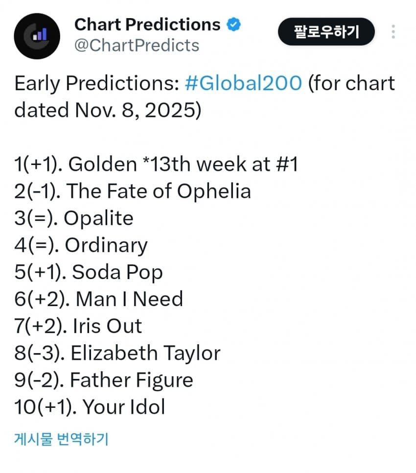 차트 프레딕션즈 SNS는 초기 예측에서 "헌트릭스(HUNTR/X) 이재(EJAE), 오드리 누나(Audrey Nuna), 레이 아미(Rei Ami)의 '골든'이 다음주 11월 8일 차트 글로벌200 에서 1위를 탈환할 것으로 예상된다"며 "빌보드200 차트에서 1위는 통산 13주째를 기록할 것으로 보인다"고 전망했습니다.