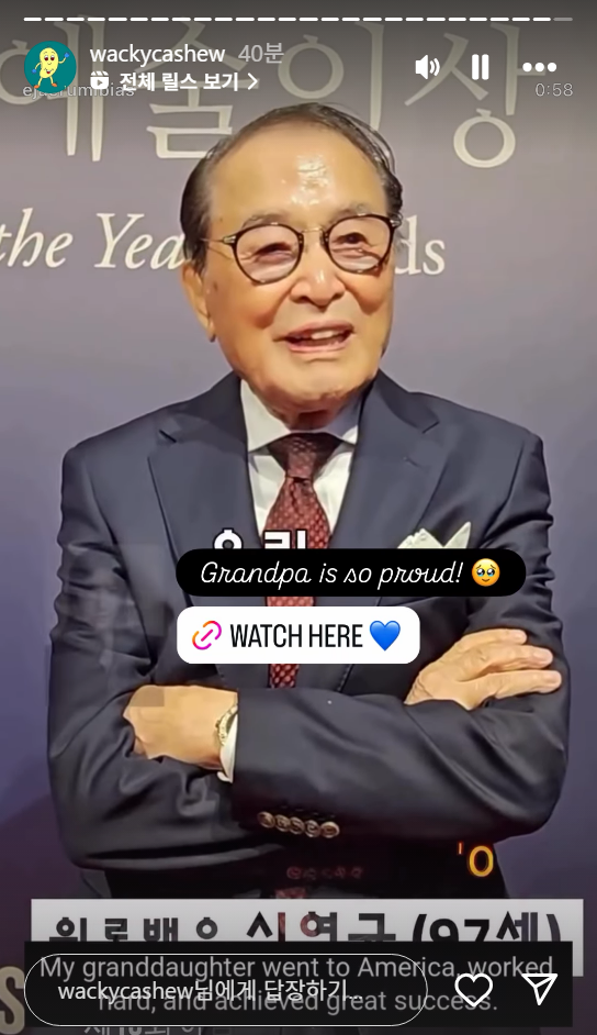 이재(EJAE)의 외할아버지 신영균 원로배우가 97세라는 나이가 믿기지 않을 정도로 정정한 모습으로 외손녀 이재에게 축하 인사말과 함께 세계적 스타가 되기를 바란다는 메시지를 전했습니다.