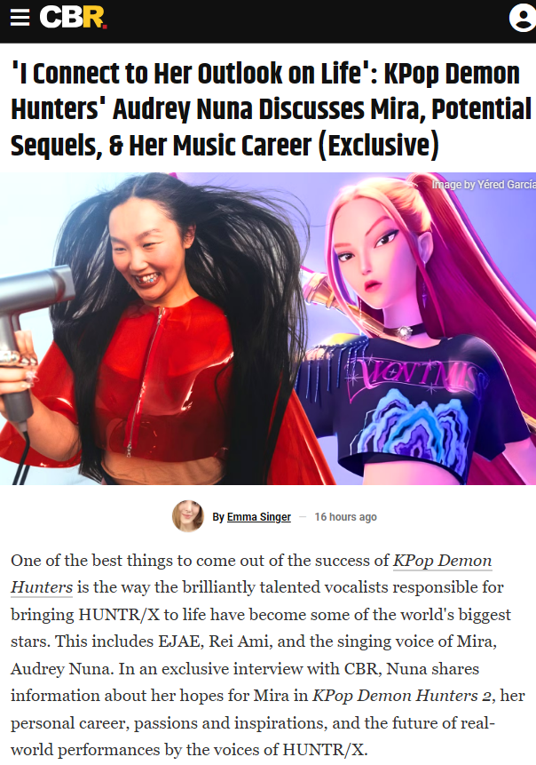 미국 연예 매체 CBR은 오드리 누나(Audrey Nuna)와의 단독 인터뷰를 갖고 "'미라의 인생관에 공감해요': 오드리 누나, 케데헌 미라 역, 잠재적인 속편, 음악 커리어에 대해 이야기하다"라는 제목의 기사를 보도했습니다.