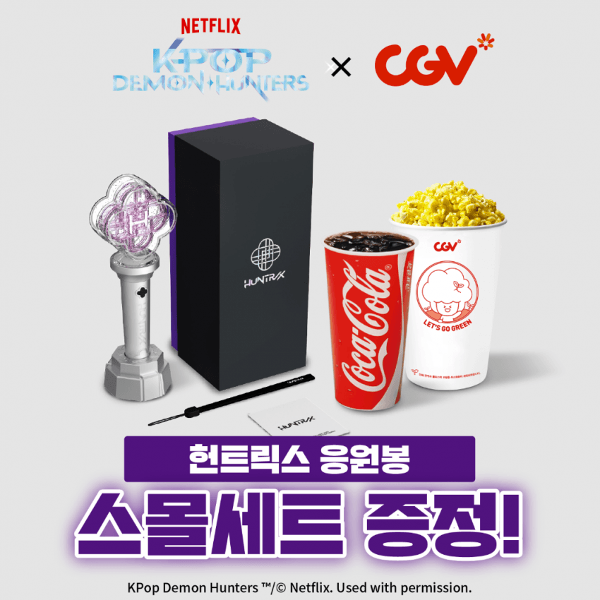 CGV는 10월 31일부터 11월 2일까지 전국 100개 영화관에서 진행하는 '케데헌 싱어롱' 관련 공식 응원봉을 제공하는 스몰세트를 판매한다고 밝혔습니다.