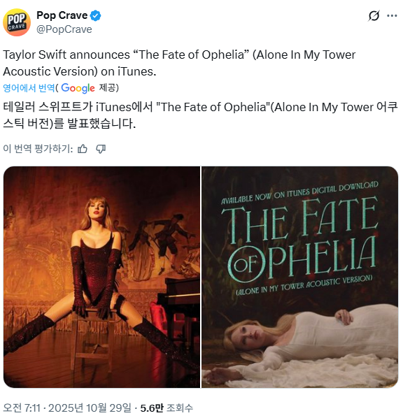 넷플릭스 애니메이션 영화 'K팝 데몬헌터스' 즉 '케데헌(KDH)'이 글로벌 신드롬을 오개월째 이어가는 가운데 '골든'이 다시 영국 오피셜 차트 및 미국 빌보드 핫100 차트 1위를 탈환한다는 초기 예측이 나오자 테일러 스위프트(Taylor Swift)가 아이튠즈에서 신곡 '더 페이트 오브 오필리아(The Fate of Ophelia)' 어쿠스틱 버전을 발매했습니다.