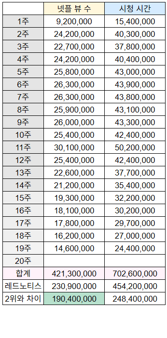 이로써 압도적 1위의 '케데헌'과 2위 '레드노티스'의 차이는 1억 9040만뷰 차이가 났습니다.