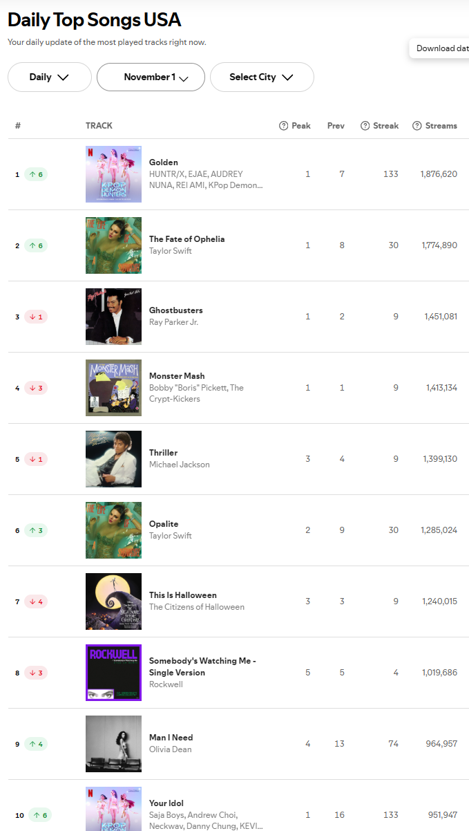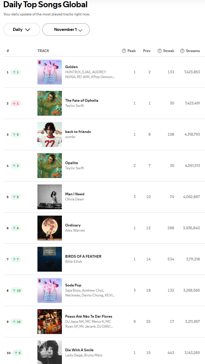 세계 최대 음원 플랫폼 스포티파이 글로벌 데일리 차트 그리고 USA 데일리 차트에서 헌트릭스 '골든'이 3주 만에 다시 1위를 탈환했습니다.