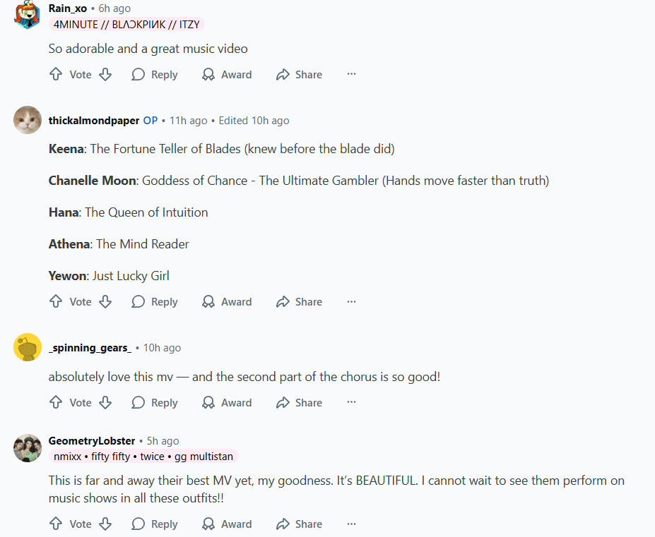 세계 최대 커뮤니티 레딧(reddit)에서 해외 네티즌들은 "이것은 나의 다음 기상 알람이 될 수 있습니다. 너무 귀엽고 쾌활합니다.. 분위기가 너무 좋아요", "너무 사랑스럽고 멋진 뮤직 비디오", "키나(Keena) 칼날의 점쟁이 (칼날보다 먼저 알았음), 문샤넬 기회의 여신...궁극의 도박꾼 (손은 진실보다 더 빨리 움직인다), 하나: 직관의 여왕, 아테나: 마인드 리더, 예원: 그냥 럭키 걸", "이것은 단연 최고의 MV입니다. 아름다워요. 그들이 이 모든 의상을 입고 음악 쇼에서 공연하는 모습을 빨리 보고 싶습니다!!", "특히 후렴구가 정말 좋은 노래예요! 피프티피프티는 계속해서 훌륭한 음악을 만들어내고 있어요! MV도 정말 재미있고 예쁘고 비주얼이 너무 좋아요.", "모든 것이 마음에 듭니다. 심플하고 사랑스럽습니다" 등 호평을 보냈습니다.