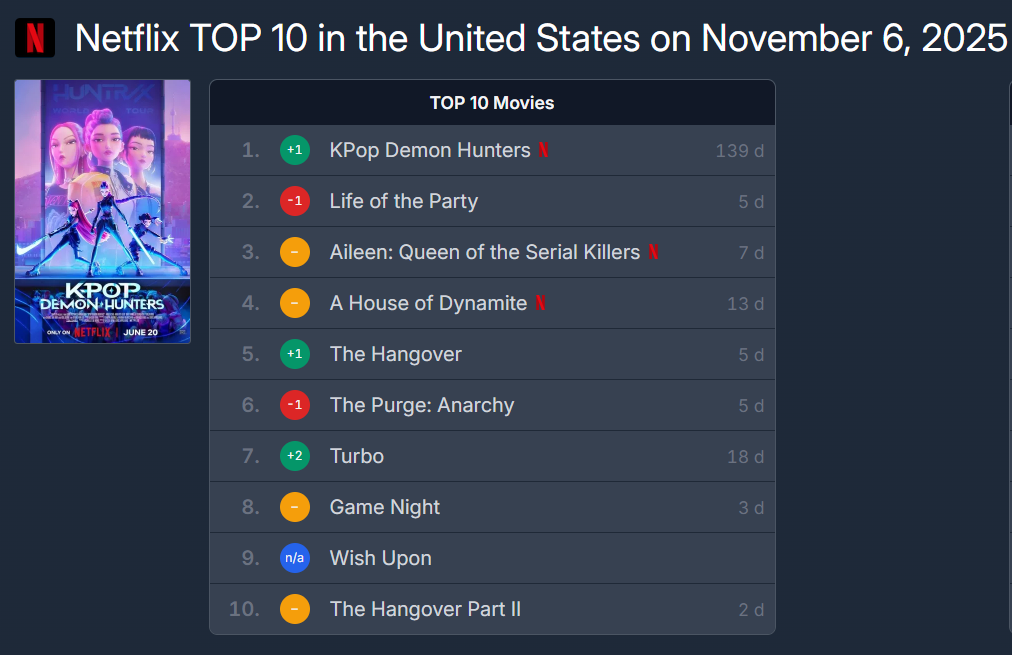 넷플릭스 애니메이션 영화 'K팝 데몬헌터스' 즉 '케데헌(KDH)'이 글로벌 신드롬을 오개월째 이어가는 가운데 '케데헌'이 넷플릭스 USA에서 1위를 탈환했습니다.