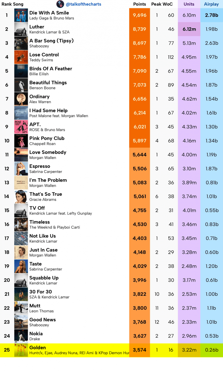 구체적인 순위는 '골든' 25위, '유어 아이돌' 54위, '소다팝' 61위, '하우 잇츠 던(How It's Done)' 68위, '왓 잇 사운즈 라이크(What It Sounds Like)' 83위, '프리(Free)' 92위, '테이크다운' 93위 였습니다.